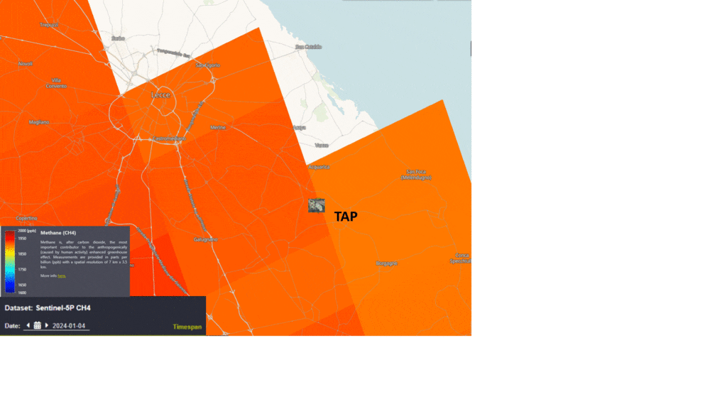 Massimo Morigi, a veteran satellite data analyst and member of the Italian environmental association Cova Contro, used Sentinel-5P readings to analyse methane levels at three sites before and after TAP became operational in 2020: two compressor stations in Greece and Albania, and the pipeline reception terminal in Melendugno.