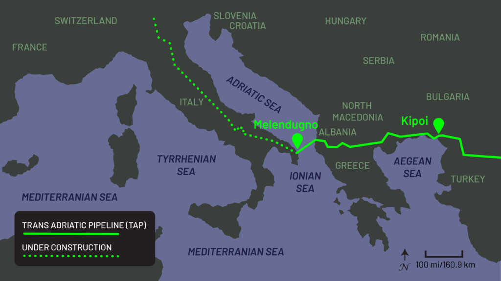 TAP connects with the Southern Gas Corridor at Kipoi, Greece, on the Turkish-Greek border. From there, it crosses northern Greece to Albania, then Albania to the floor of the Adriatic Sea, and comes ashore at Melendugno, where it links to Italyโs gas network.