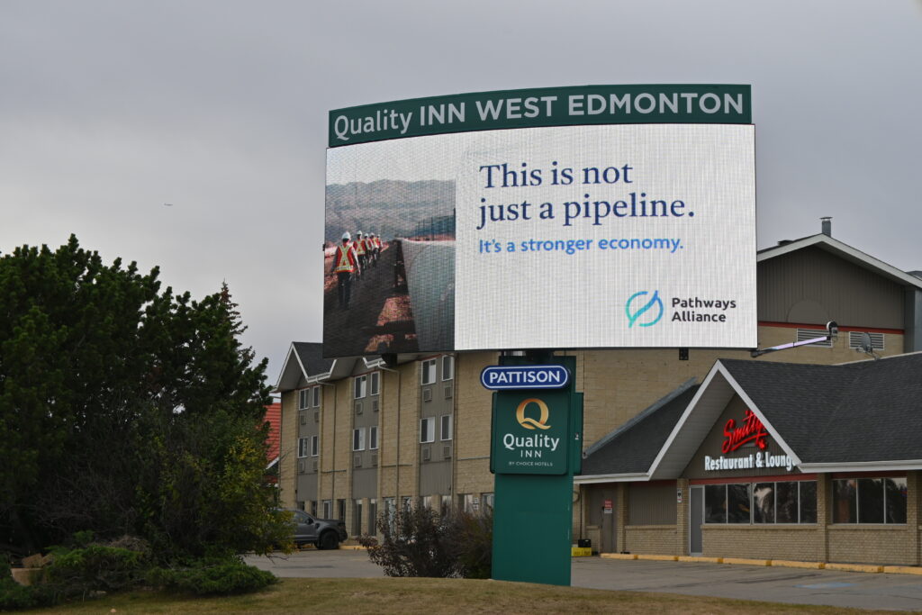 In a potential indication of major project retooling, new advertisements from Pathways Alliance, recently spotted in Alberta, are moving away from references to carbon capture. An electronic billboard photographed by DeSmog in Edmonton stated โThis is not just a pipeline. Itโs a stronger economy.โ