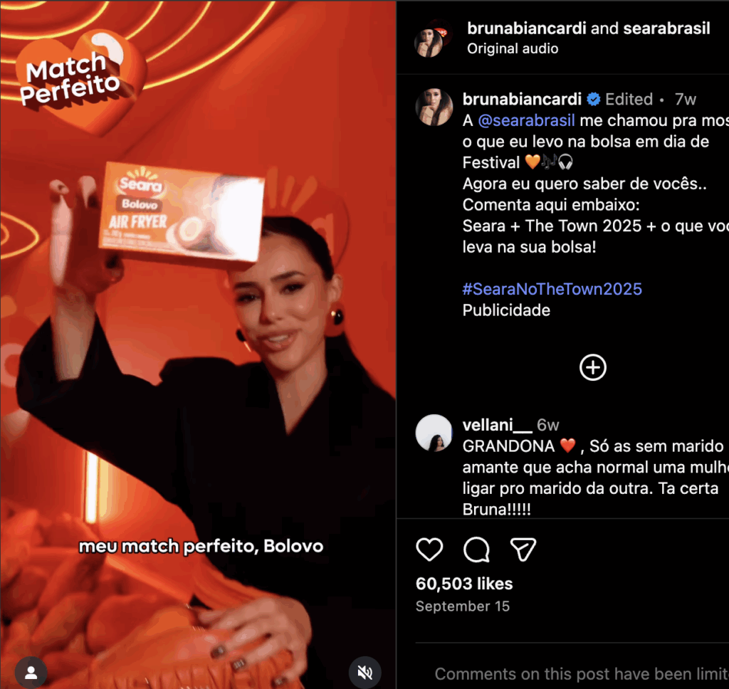 During the โThe Townโ music festival in Sรฃo Paulo in September, fashion influencer Bruna Biancardi posted a video of herself opening her designer handbag to reveal fried chicken products made by Seara, a JBS brand, with the caption: โ@searabrasil invited me to show what I carry in my bag on festival days.โ Biancardi has 14.5 million followers.