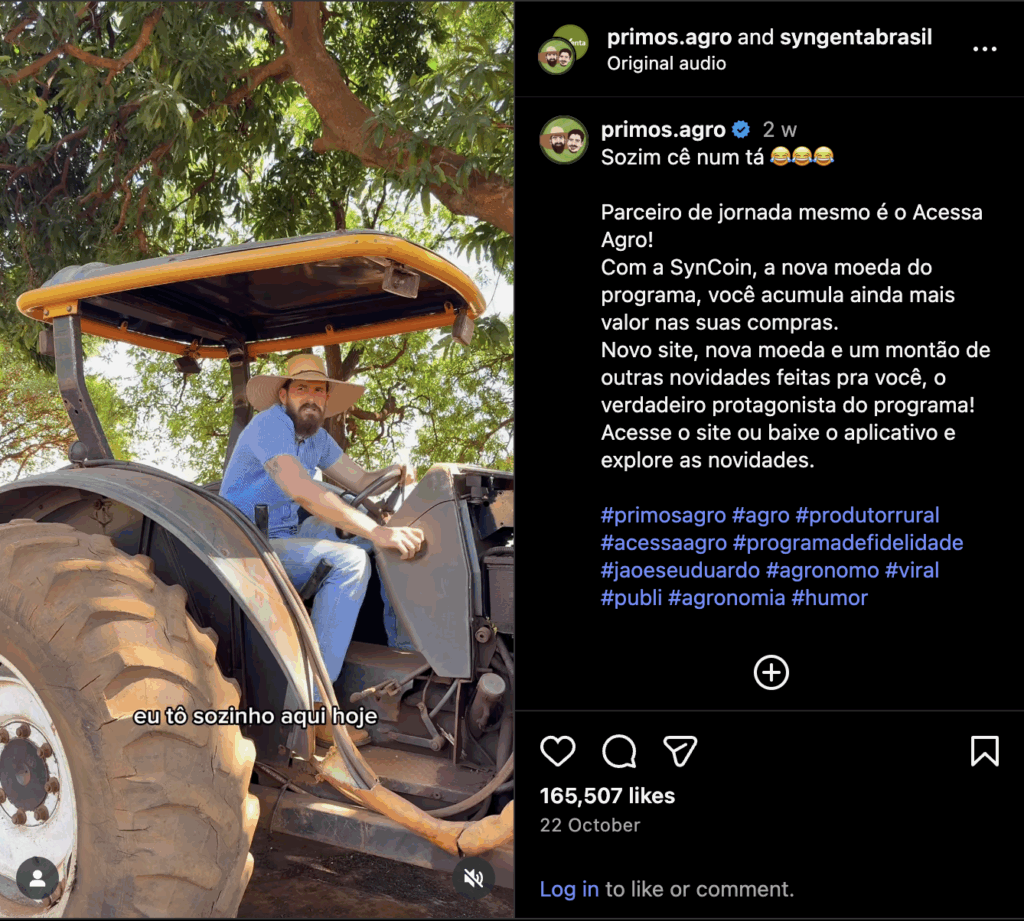 Primos Agro, a channel run by two cousins who make satirical videos about their lives as farmers, posted twice to their 2.1 millions followers in September and October, promoting Syngenta fertilizer products. The videos garnered a combined 280,000 likes.