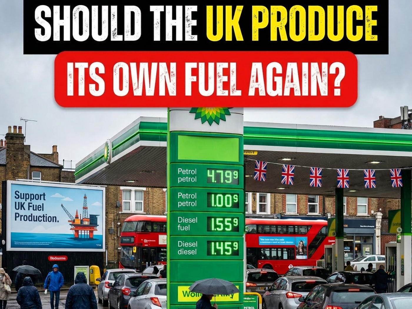 A imagem, juntamente com dezenas de outras semelhantes, mostra uma cena genérica gerada por IA de carros estacionados na frente de um posto de gasolina, acompanhada de um texto que levanta uma questão aparentemente inocente: "O Reino Unido deveria voltar a produzir seu próprio combustível?"
